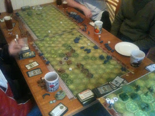 The Memoir '44 Campaign Day was excellent fun. We had six players and we managed to play the whole thing in the time allowed. We started at around noon and finished proceeds including a break for lunch at about six. We played the Operation Barbarossa campaign from the Memoir '44 Campaign Book Number 1.